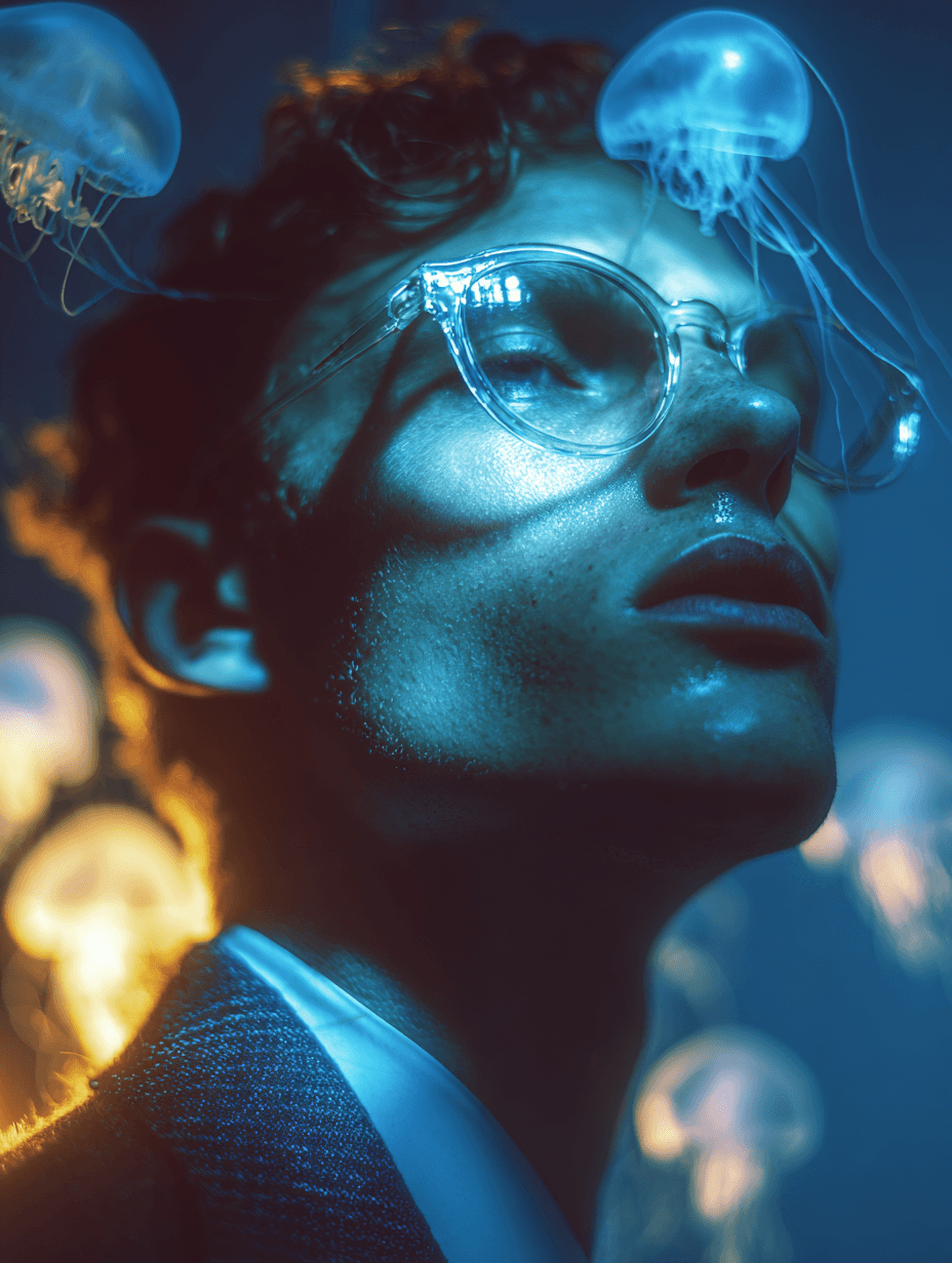 Dit beeld maakte deel uit van een conceptuele verkenning voor een toegankelijk brillenmerk waarbij de focus lag op merkbeleving in plaats van productpresentatie. Geïnspireerd door hedendaagse direct-to-consumer eyewear brands en editoriale modefotografie, was het doel om een visuele wereld te creëren die rust en onderscheid uitstraalt. De surrealistische elementen, zoals mariene vormen en vervormd licht, werden bewust ingezet om het idee van kijken en waarnemen te versterken, zonder het product letterlijk centraal te plaatsen.