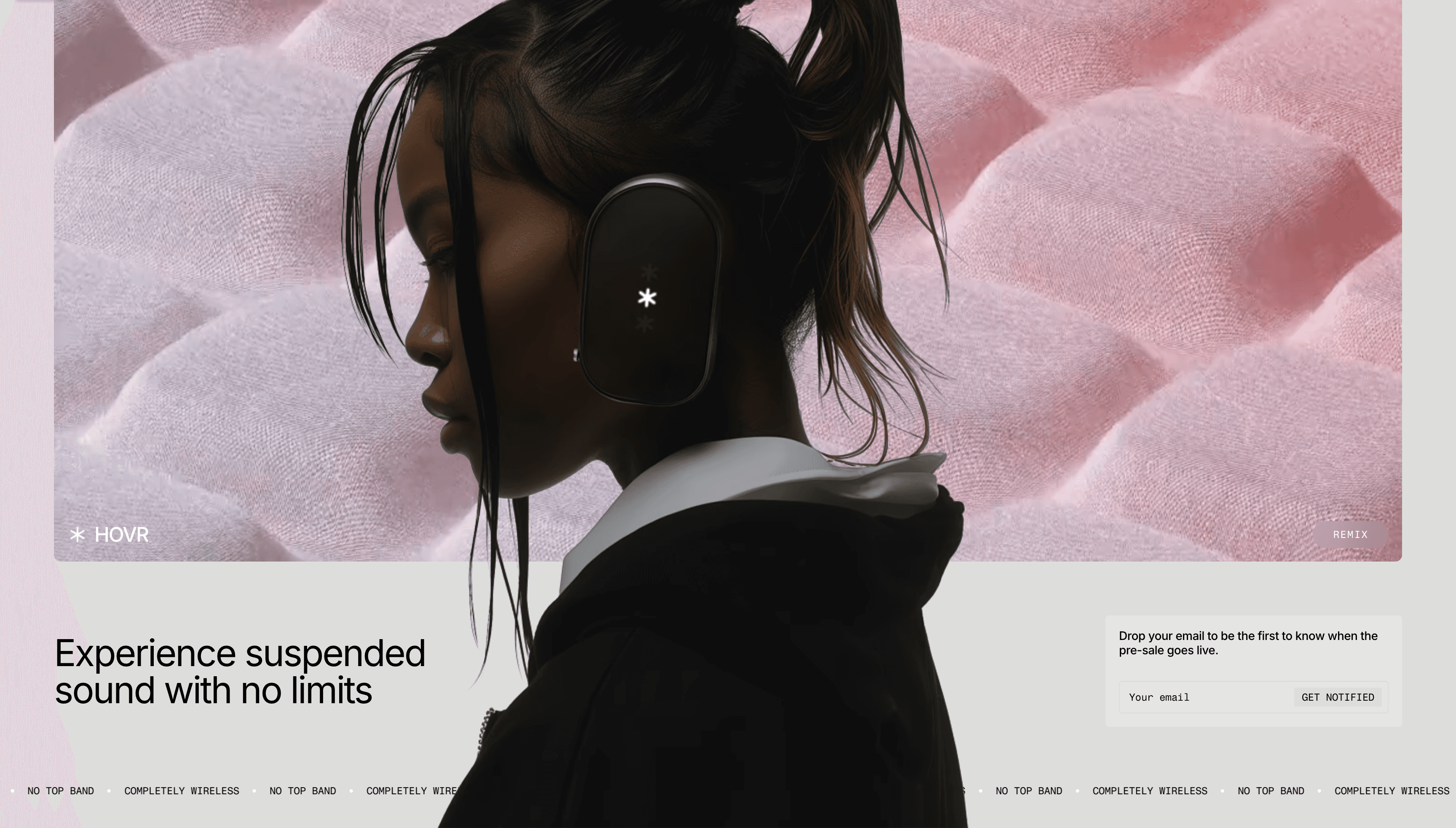Dit concept toont een sign-up landingspagina voor draadloze headphones, ontworpen om beleving en merkgevoel centraal te zetten vóór de lancering. Door een minimalistische interface te combineren met sterke editoriale visuals, ligt de focus volledig op anticipatie en één duidelijke actie: inschrijven.